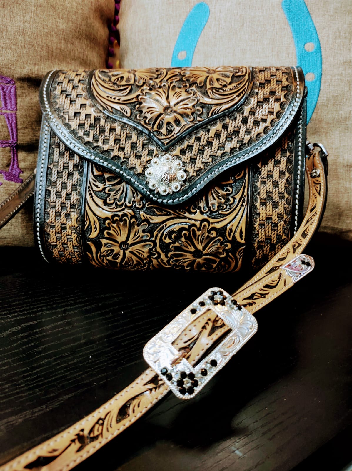 Made by the same artist who makes all of our WhinneyLite saddles - this purse is a work of art. Hand drawn and tooled basket weave & floral design on front & back.