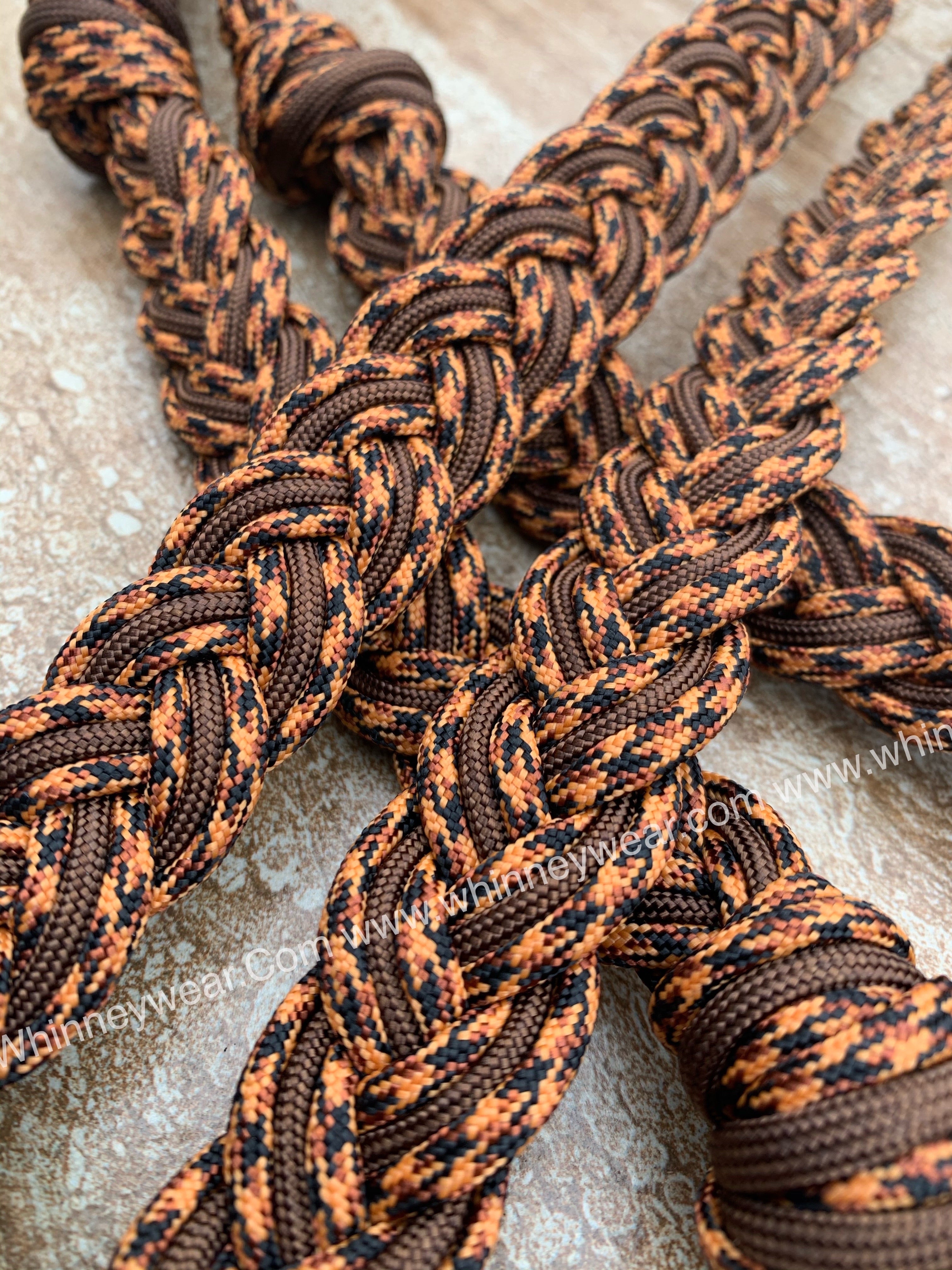 Hand braided reins in our rot, mildew and fade resistant cord. These reins come with 2 conways for easy adjusting. Reins measure 8ft long and include 4 knots for hand placement. Easy to wash, just throw in washing machine and let air dry :)