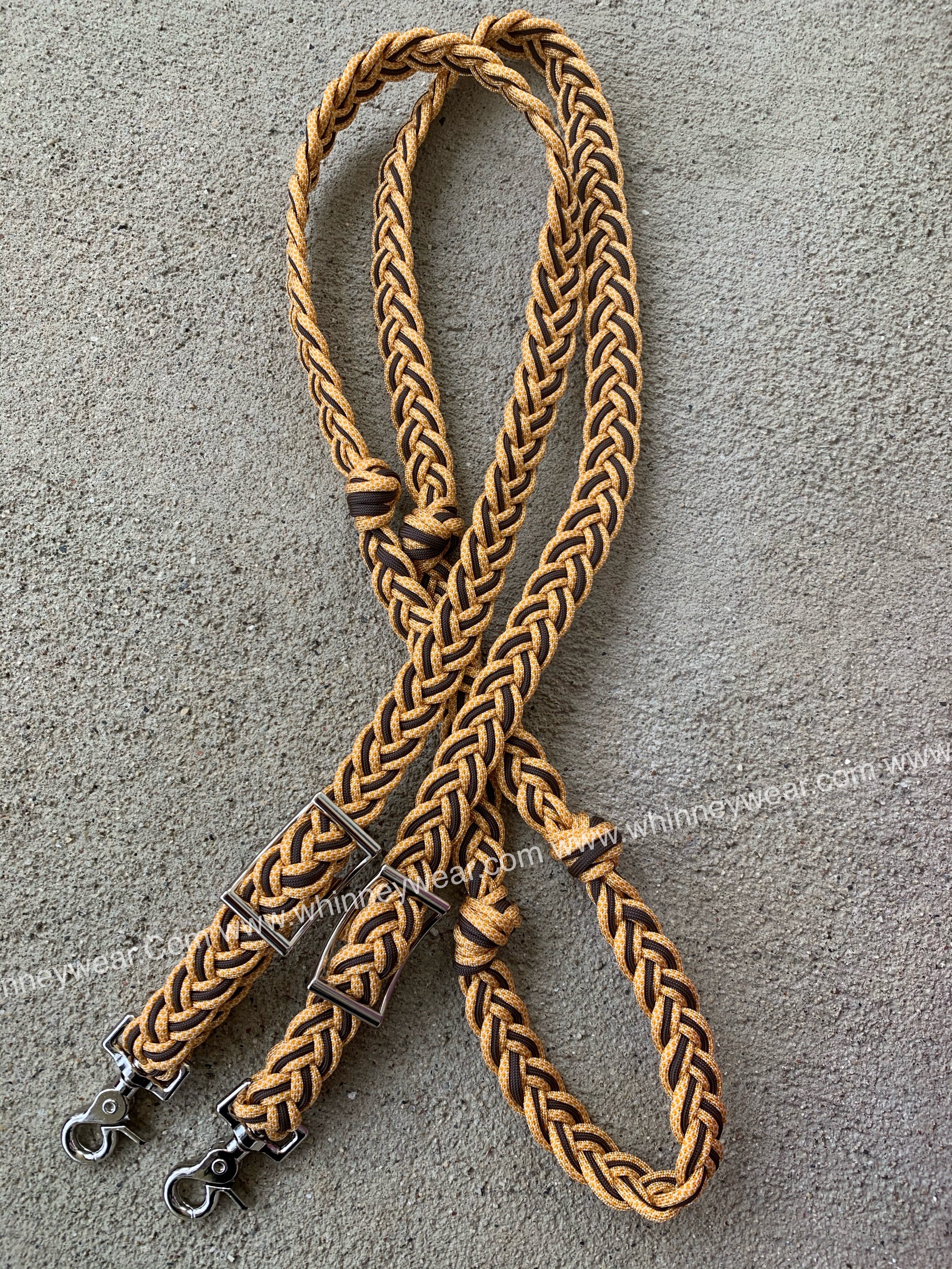 Hand braided reins in our rot, mildew and fade resistant cord. These reins come with 2 conways for easy adjusting. Reins measure 8ft long and include 4 knots for hand placement. Easy to wash, just throw in washing machine and let air dry :)
