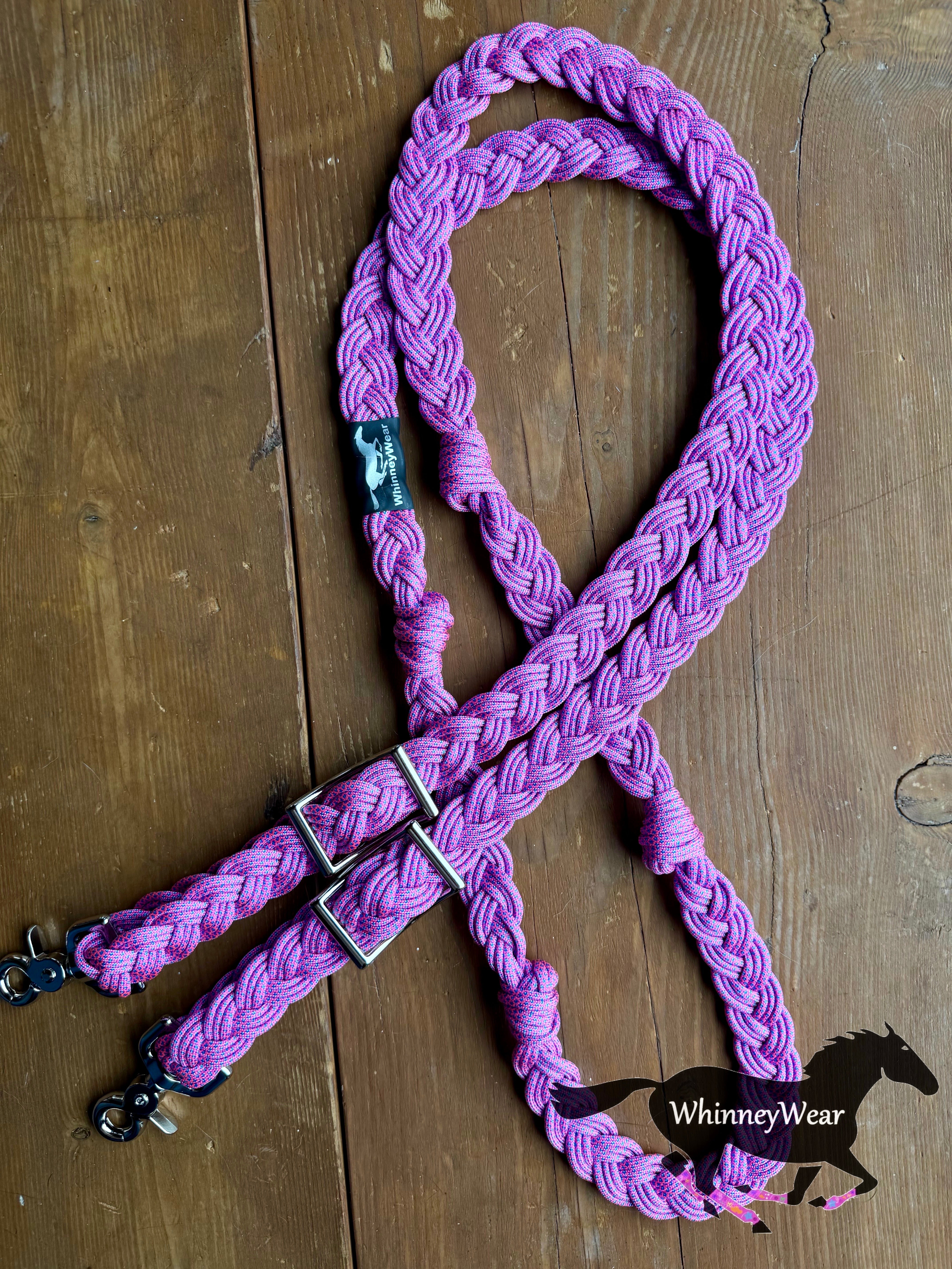 Hand braided reins in our rot, mildew and fade resistant cord. These reins come with 2 conways for easy adjusting. Reins measure 8ft long and include 4 knots for hand placement. Easy to wash, just throw in washing machine and let air dry :)