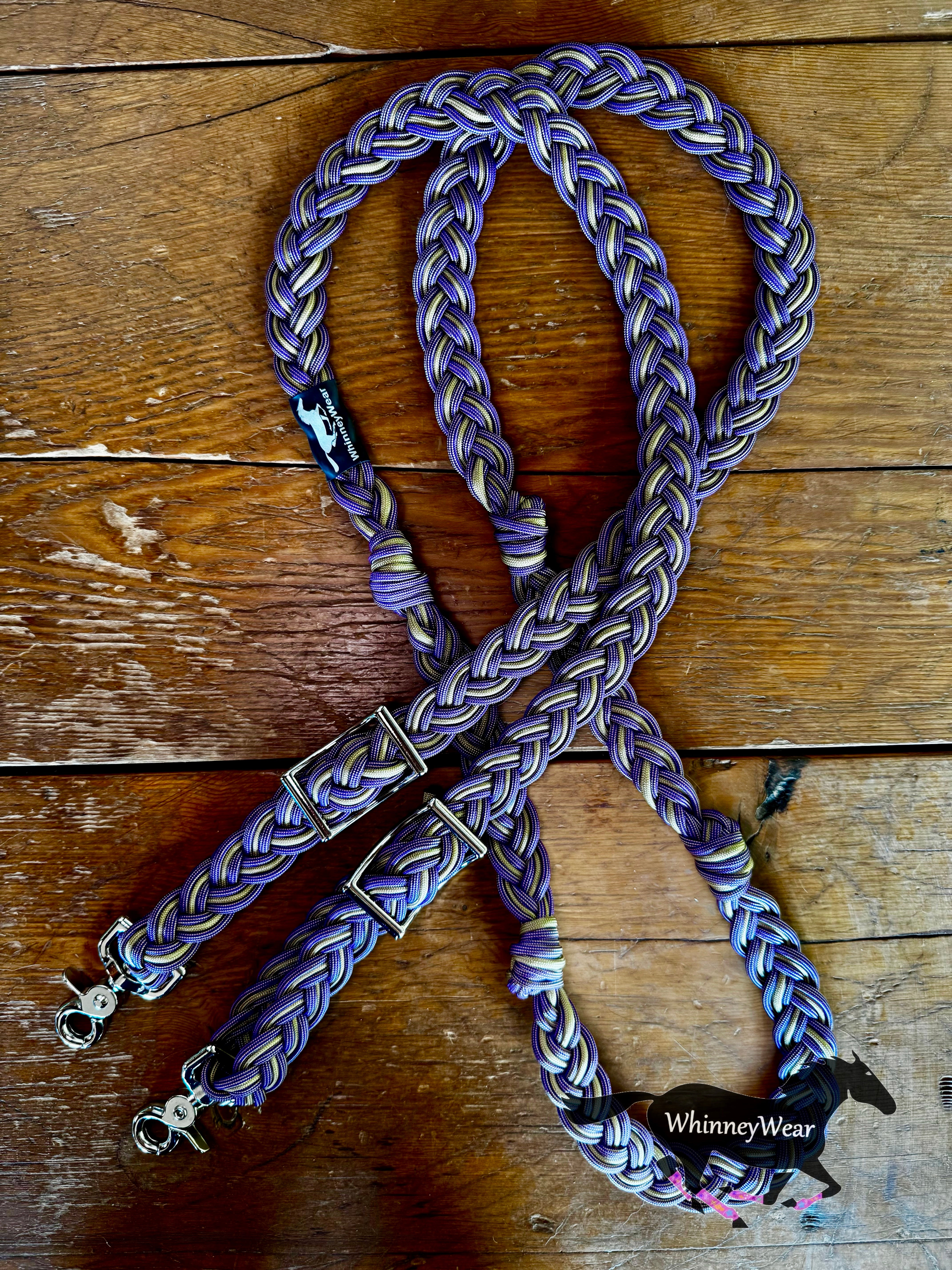 Hand braided reins in our rot, mildew and fade resistant cord. These reins come with 2 conways for easy adjusting. Reins measure 8ft long and include 4 knots for hand placement. Easy to wash, just throw in washing machine and let air dry :)