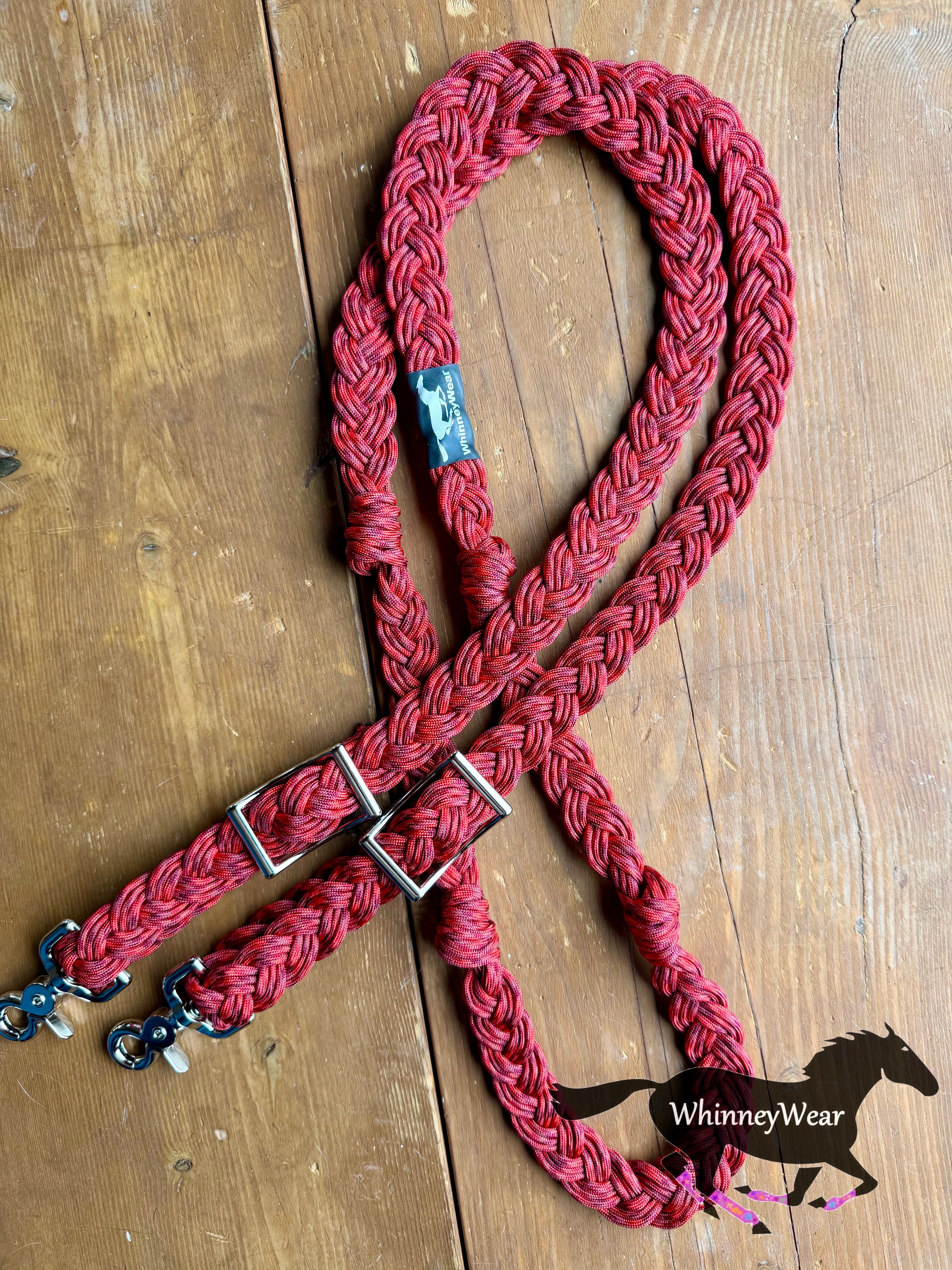 Hand braided reins in our rot, mildew and fade resistant cord. These reins come with 2 conways for easy adjusting. Reins measure 8ft long and include 4 knots for hand placement. Easy to wash, just throw in washing machine and let air dry :)