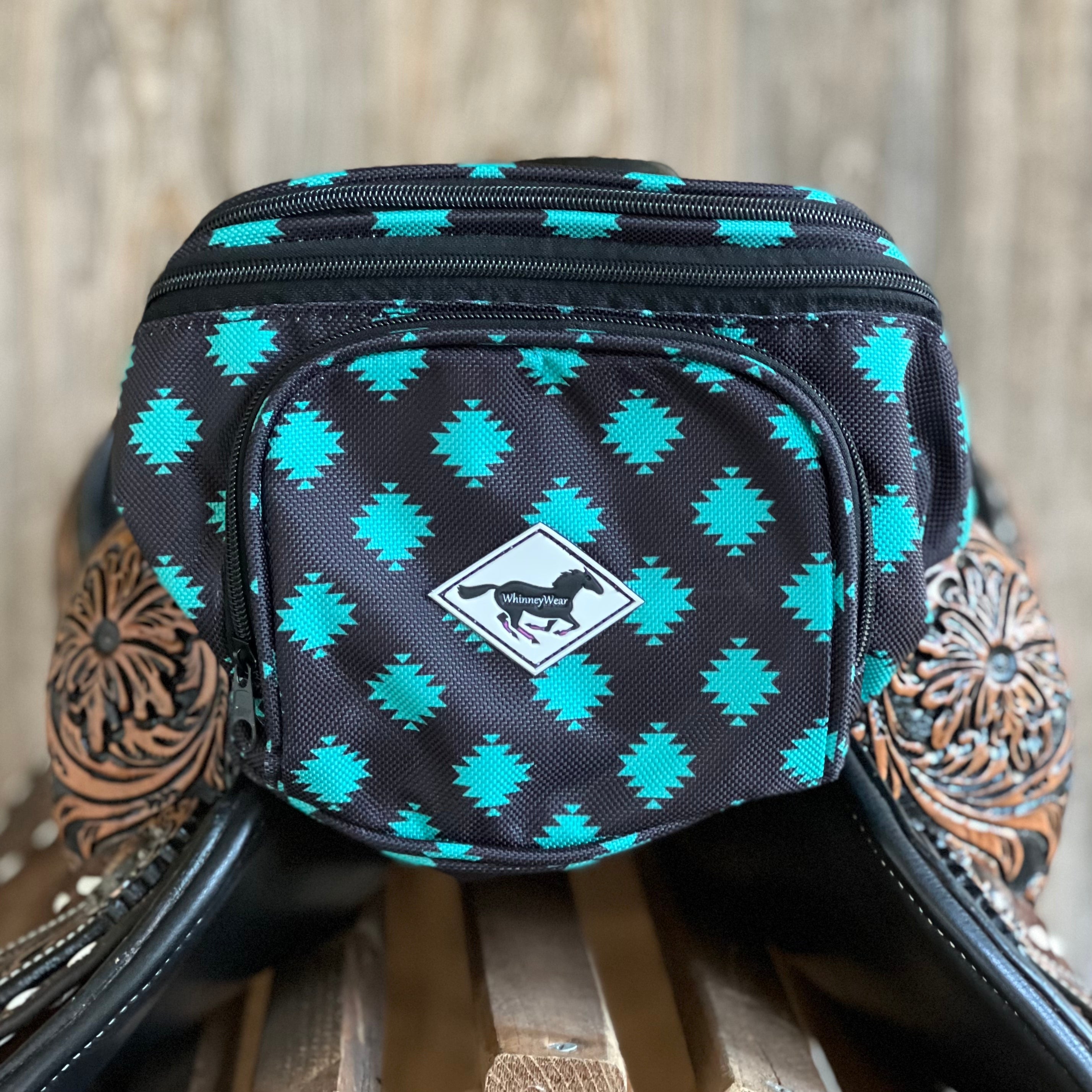 Created to be fashionable and functional, these PommelPacks are made out of a patterned vinyl with 2 zippered compartments for your essentials you may need on hand while riding including your phone, keys, photo ID, money or even a snack :)