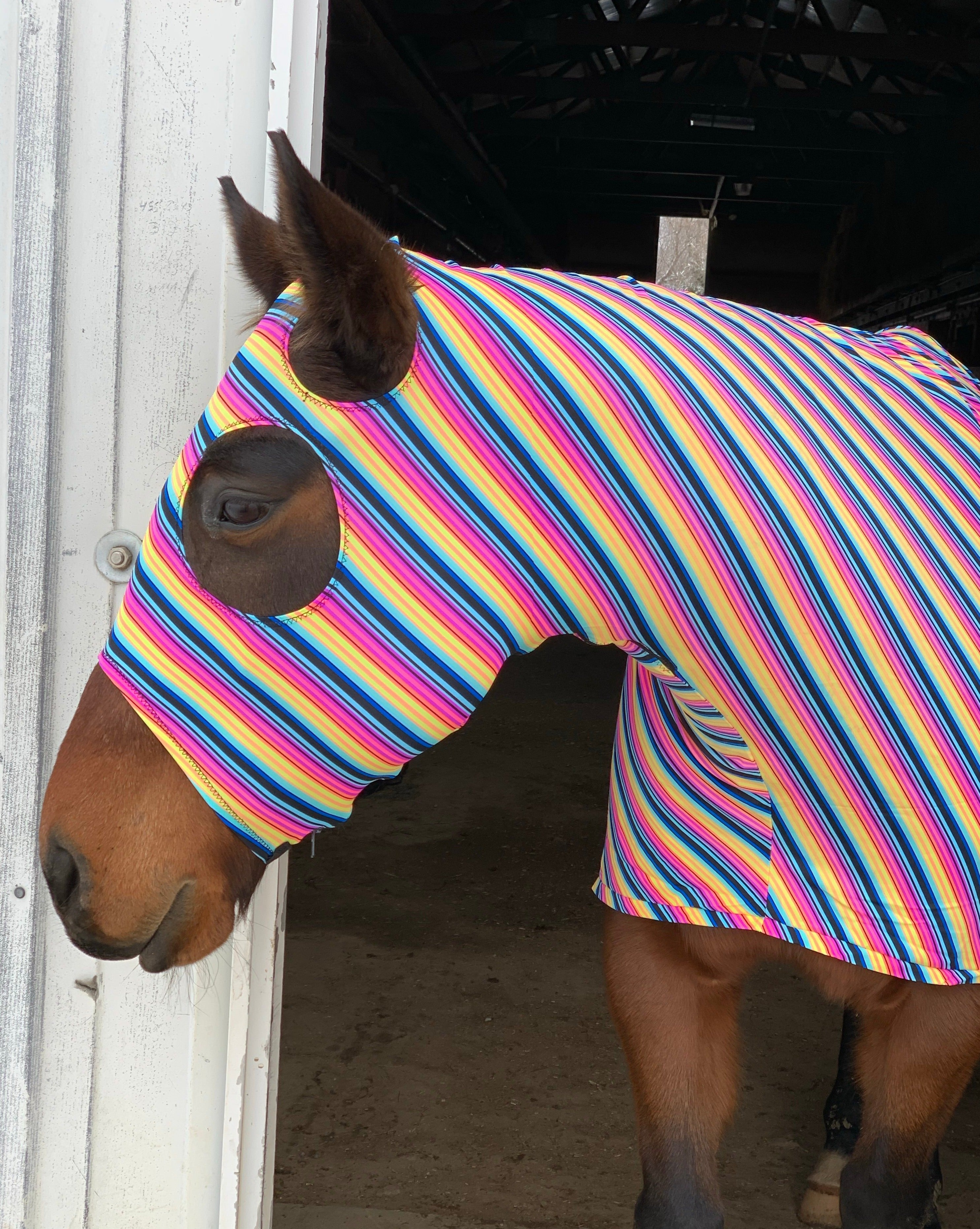 Stylish and Functional! These slinky hoods are one size, fitting equines who wear blankets between 72-78". Elastic belly band with clip and 24" zipper from mid-chest to under chin. Please allow 2 days to ship