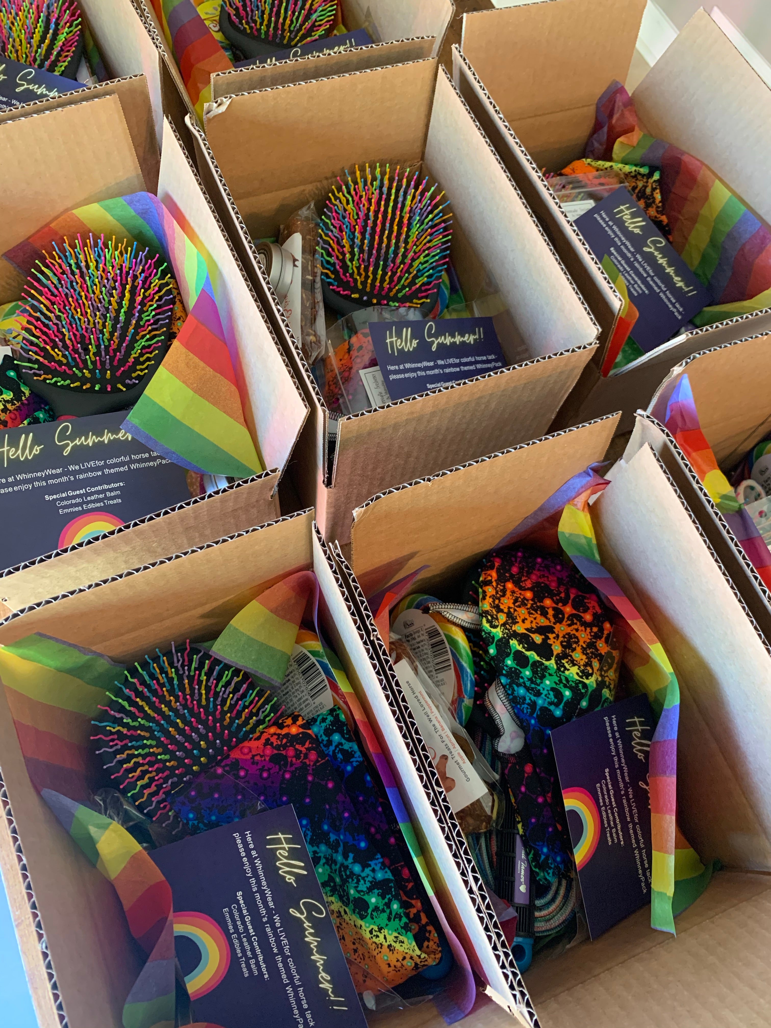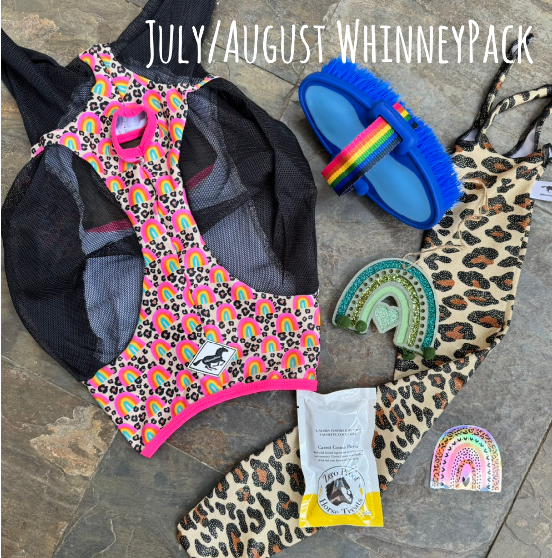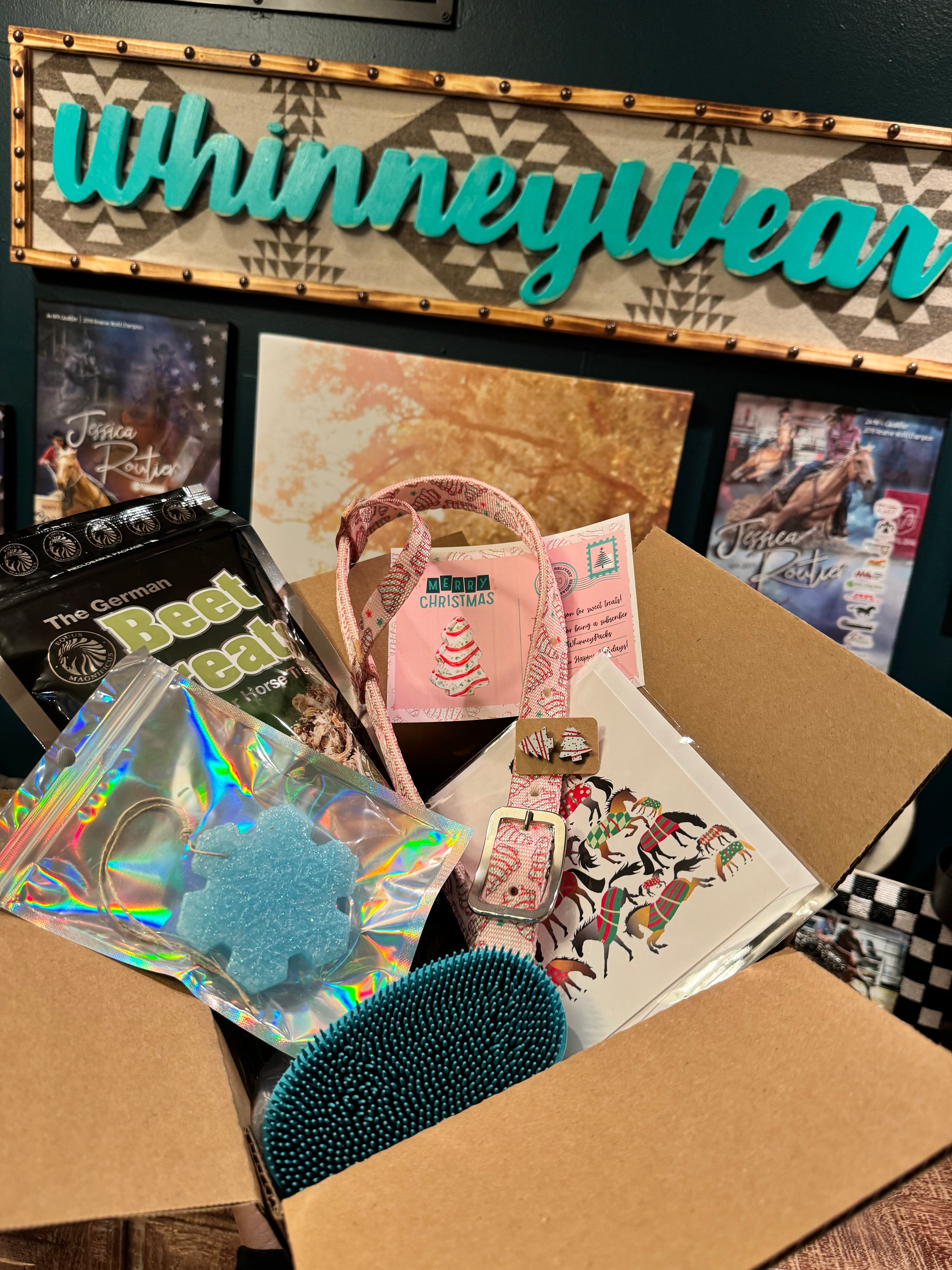 Packs will include items like an air freshener, tailbag, pack of horse treats & a few surprise small items in addition to one special edition item such as a nylon halter, pommel pack, braided reins, or bell boots which will vary each shipment & will be exclusive to only WhinneyPack subscribers.