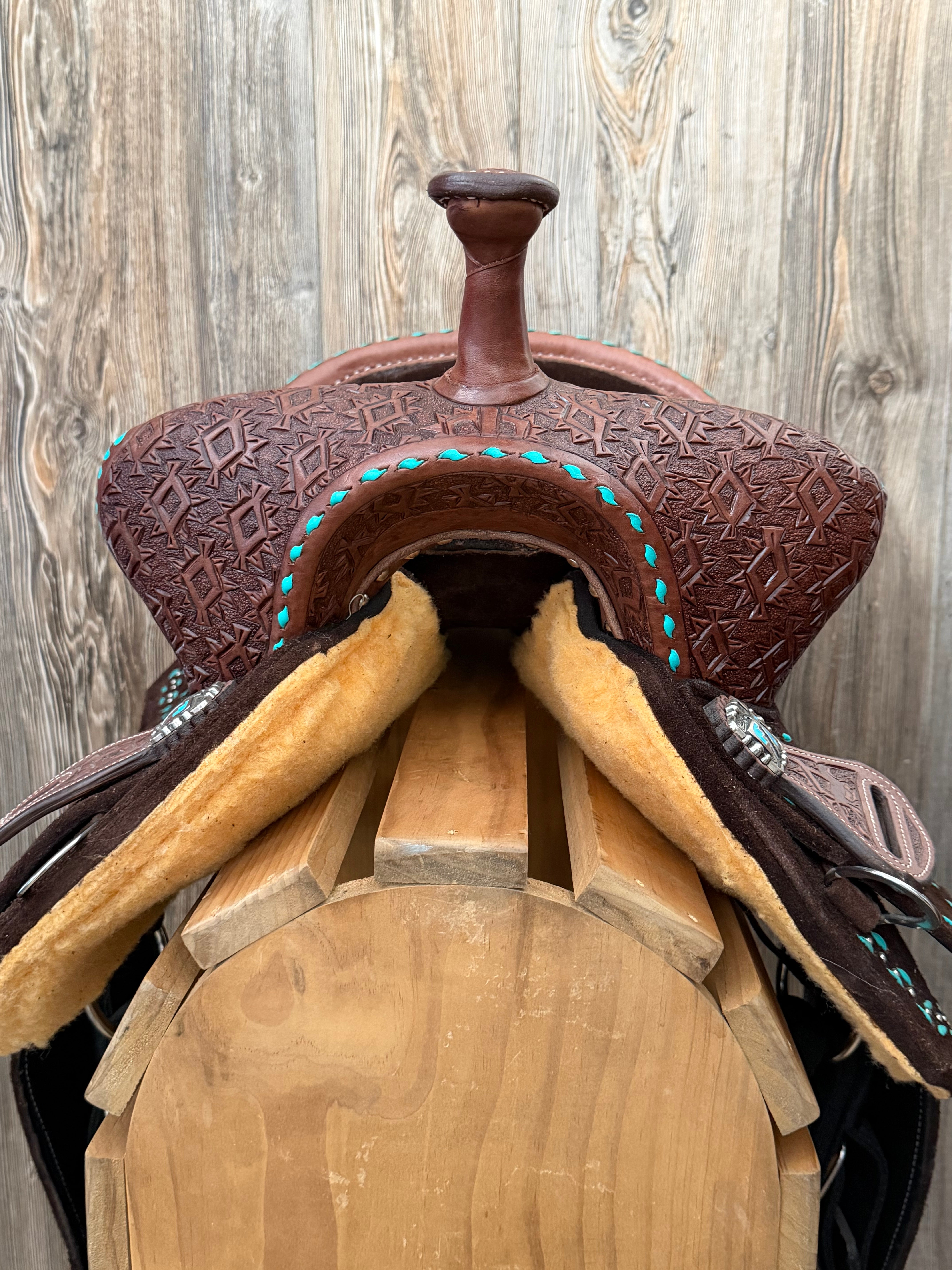 Made EXCLUSIVELY for WhinneyWear - this saddle is made with a fiberglass/wood mixed tree covered with 2mm of thick neoprene and wrapped with thin top quality Brazilian leather. This saddle only weighs 20 pounds! It features our signature aztec tooling on a square pommel & cantle. Pencil Roll style seat & aqua buckstitch & silver spot border. YOUTH LENGTH FENDERS