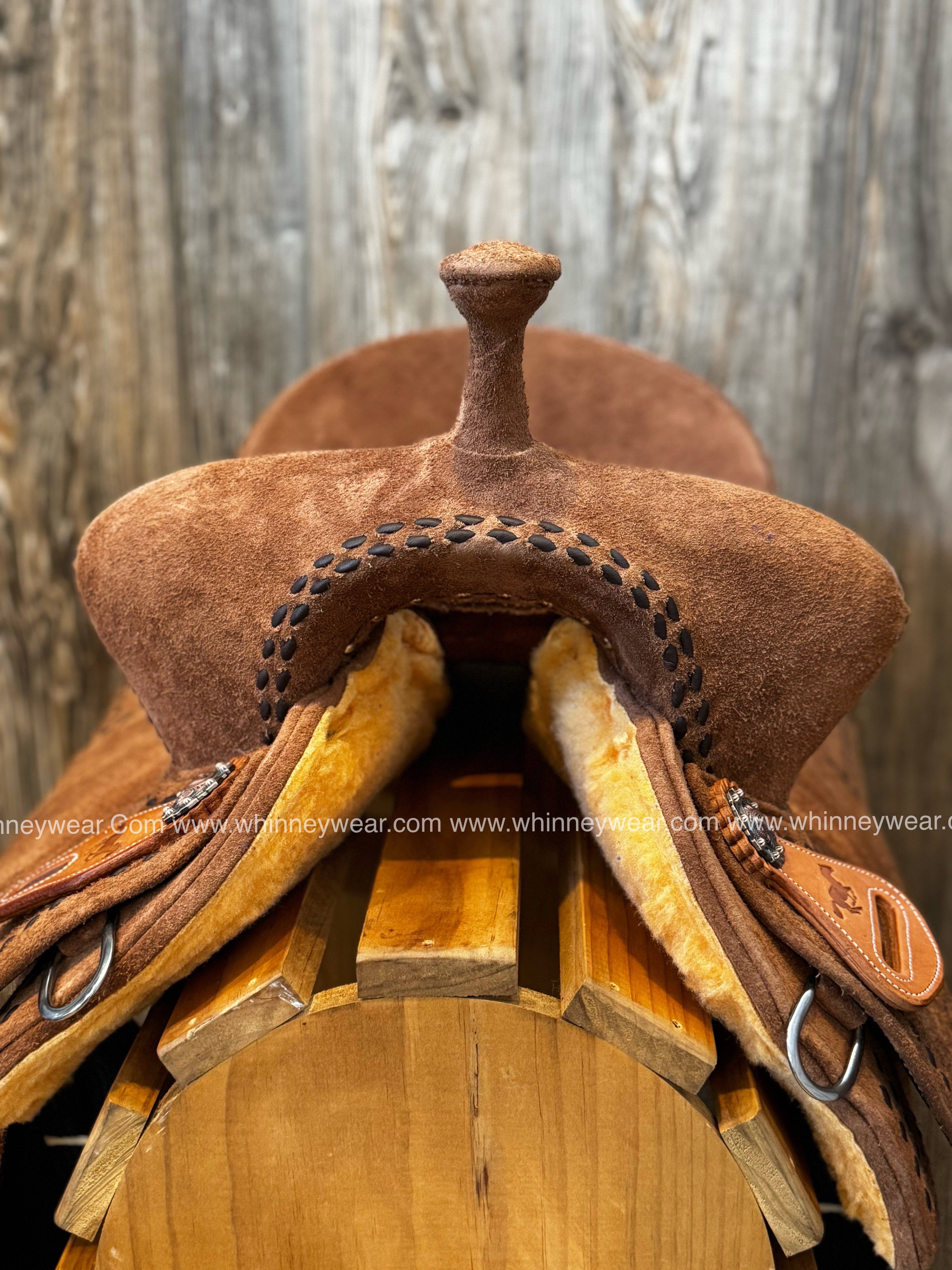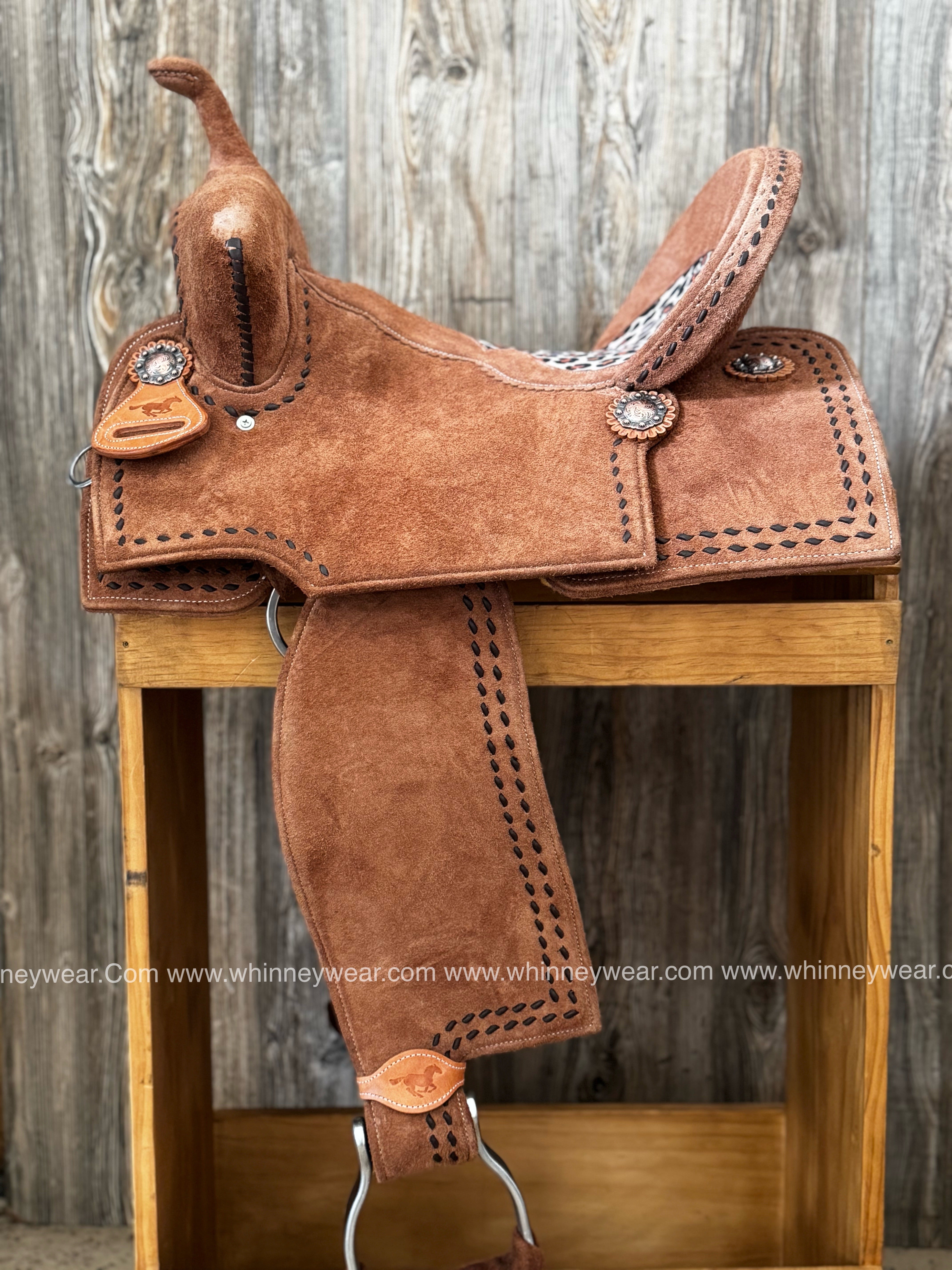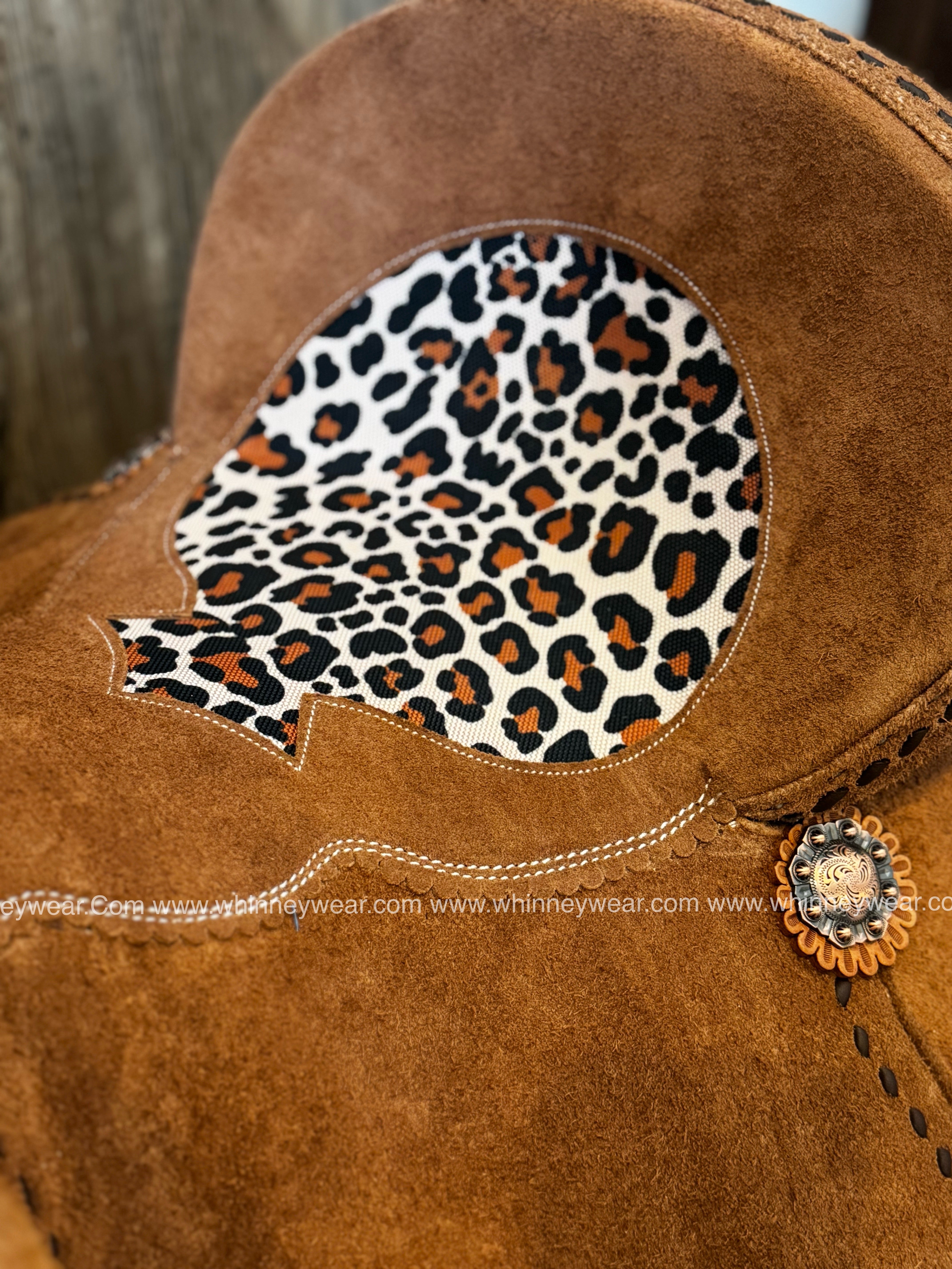 Made EXCLUSIVELY for WhinneyWear - this saddle is made with a fiberglass/wood mixed tree covered with 2mm of thick neoprene and wrapped with thin top quality Brazilian leather. This saddle only weighs 17 pounds! It features a square pommel & on NEW COLOR latte rough out, Cheyenne style seat, double brown buckstitch border with cheetah seat inlay and a nice DEEP SEAT!